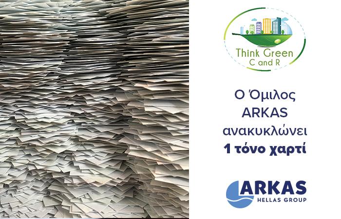 Με αίσθημα ευθύνης προς το περιβάλλον, ο Όμιλος Arkas Hellas σε συνεργασία με την εταιρεία Τhink Green C&R, προχώρησε στην ανακύκλωση 1 τόνου παλαιών εγγράφων από τo αρχείο του Ομίλου. Έγγραφα παλαιών ετών, θα αποκτήσουν νέα ζωή και θα χρησιμοποιηθούν ξανά, συμβάλλοντας στη μείωση της περιβαλλοντικής μόλυνσης.