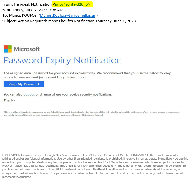 Θα θέλαμε να σας επιστήσουμε την προσοχή στα email εξαπάτησης που ζητούν να αλλάξετε τον κωδικό σας. Θα πρέπει να εξετάζετε προσεκτικά ποιος είναι ο αποστολέας έτσι ώστε να αναγνωρίζετε εάν το email είναι προσπάθεια εξαπάτησης ή όχι. Στο παρακάτω παράδειγμα, το μήνυμα μοιάζει καθόλα να είναι ένα email από την Microsoft, εκτός από τον αποστολέα που όπως φαίνεται δεν έχει καμία σχέση με την Microsoft και τις υπηρεσίες της