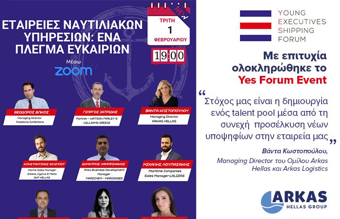 Με επιτυχία ολοκληρώθηκε το YES FORUM με θέμα “Εταιρείες Ναυτιλιακών Υπηρεσιών: ΈΝΑ ΠΛΕΓΜΑ ΕΥΚΑΙΡΙΩΝ”, στο οποίο συμμετείχε ως ομιλήτρια η κ. Βάντα Κωστοπούλου, Μanaging Director του Ομίλου Αrkas Hellas και Αrkas Logistics