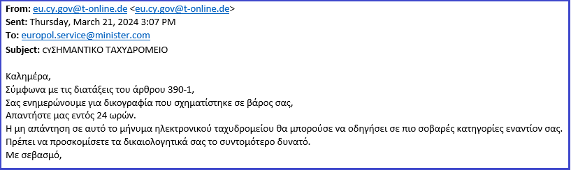 Θα θέλαμε να σας εφιστήσουμε την προσοχή στο παρακάτω πλαστό μήνυμα ηλεκτρονικού ταχυδρομείου με υποτιθέμενο αποστολέα δημόσια/κυβερνητική υπηρεσία. Σημειώνουμε πως δεν απαντάμε σε καμία περίπτωση, δεν κάνουμε click ή tap σε κανένα σύνδεσμο και το διαγράφουμε αμέσως, καθώς αποτελεί απόπειρα υποκλοπής προσωπικών δεδομένων, κωδικών ή παραβίασης λογαριασμών στο διαδίκτυο. Ευχαριστούμε. |