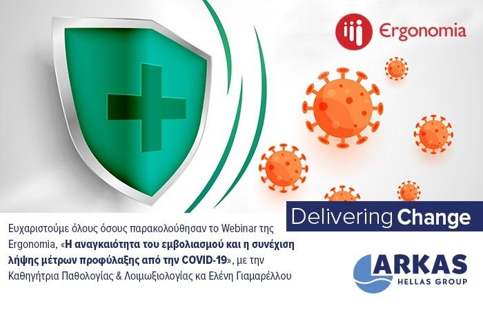 Με σκοπό να δοθούν έγκυρες πληροφορίες και υπεύθυνες απαντήσεις σε κρίσιμα ερωτήματα που απασχολούν το Ανθρώπινο Δυναμικό του Ομίλου Arkas Hellas αναφορικά με την αναγκαιότητα του εμβολιασμού και τη συνέχιση της λήψης μέτρων προφύλαξης από τον ιό COVID-19, διοργανώθηκε την Πέμπτη 15/07 δωρεάν Webinar από την εταιρία-συνεργάτη μας Ergonomia, με ομιλήτρια την Καθηγήτρια Παθολογίας & Λοιμωξιολογίας κα Ελένη Γιαμαρέλλου.
